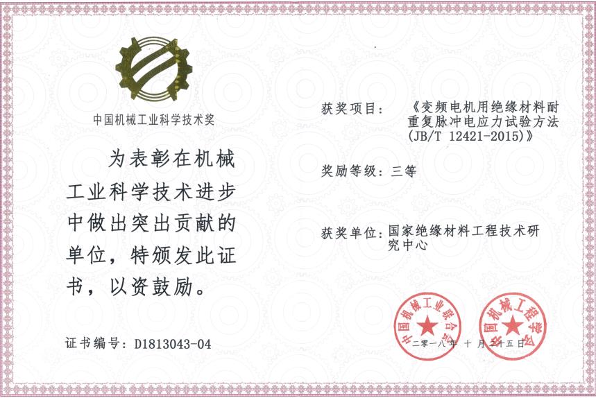 由中國機(jī)械工業(yè)聯(lián)合會和中國機(jī)械工程學(xué)會共同設(shè)立“中國機(jī)械工業(yè)科學(xué)技術(shù)獎”,是中國機(jī)械領(lǐng)域最具權(quán)威的獎項(xiàng)之一。近日,2018年度中國機(jī)械工業(yè)科學(xué)技術(shù)獎獲獎項(xiàng)目公布,我公司(國家絕緣材料工程技術(shù)研究中心)參與制定的行業(yè)標(biāo)準(zhǔn)JB/T12421-2015《變頻電機(jī)用絕緣材料耐重復(fù)脈沖電應(yīng)力試驗(yàn)方法》榮獲 ...