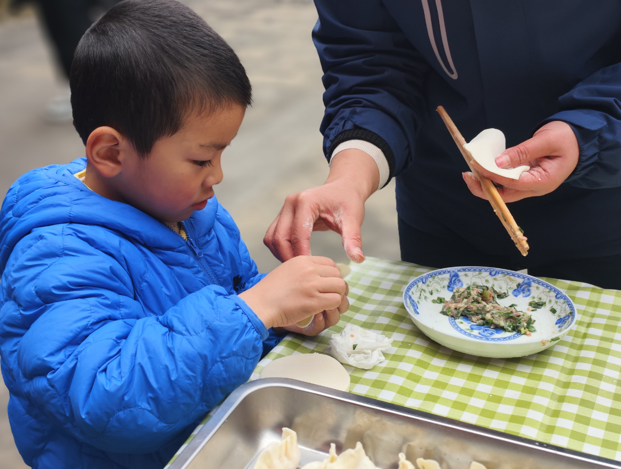 大家一邊包著餃子,一邊拉著家常。一個只有5、6歲的小朋友也加入到包餃子的隊伍中,一雙稚嫩的小手,學著大人的樣子,像模像樣地包起了餃子。